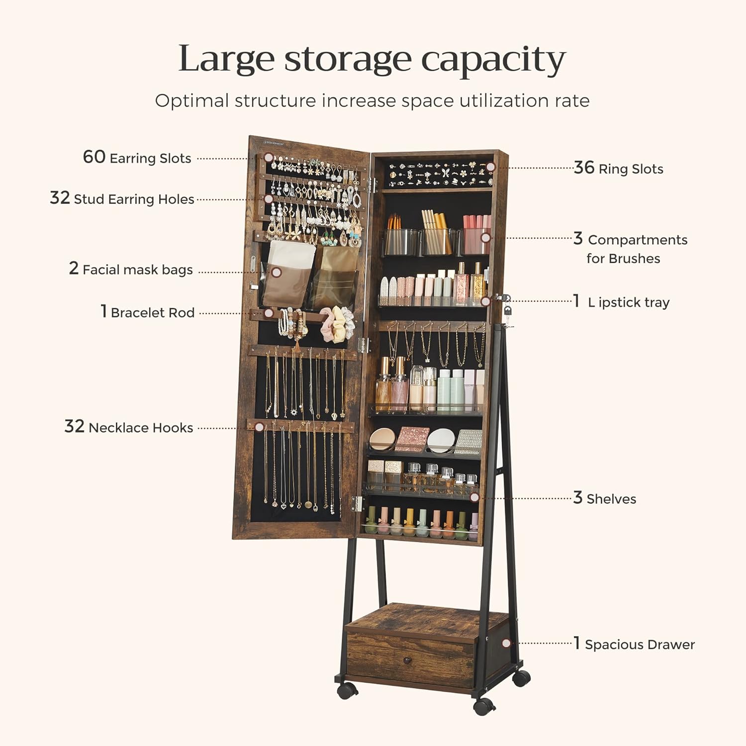 - FROM ROOM TO ROOM: Fill it, move it, lock it in place, check out your outfit with the large, full-length mirror. You can easily glide this jewelry cabinet with 4 wheels from one room to another and lock it in place as you get ready for a night out