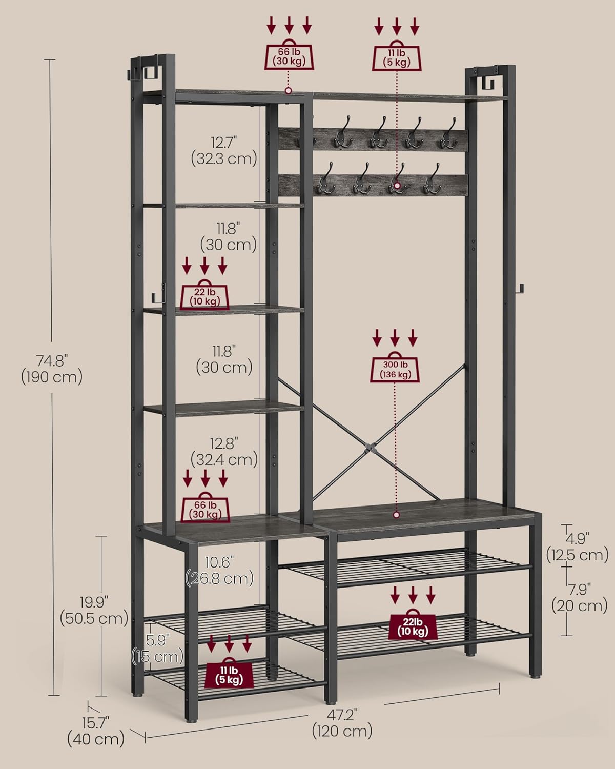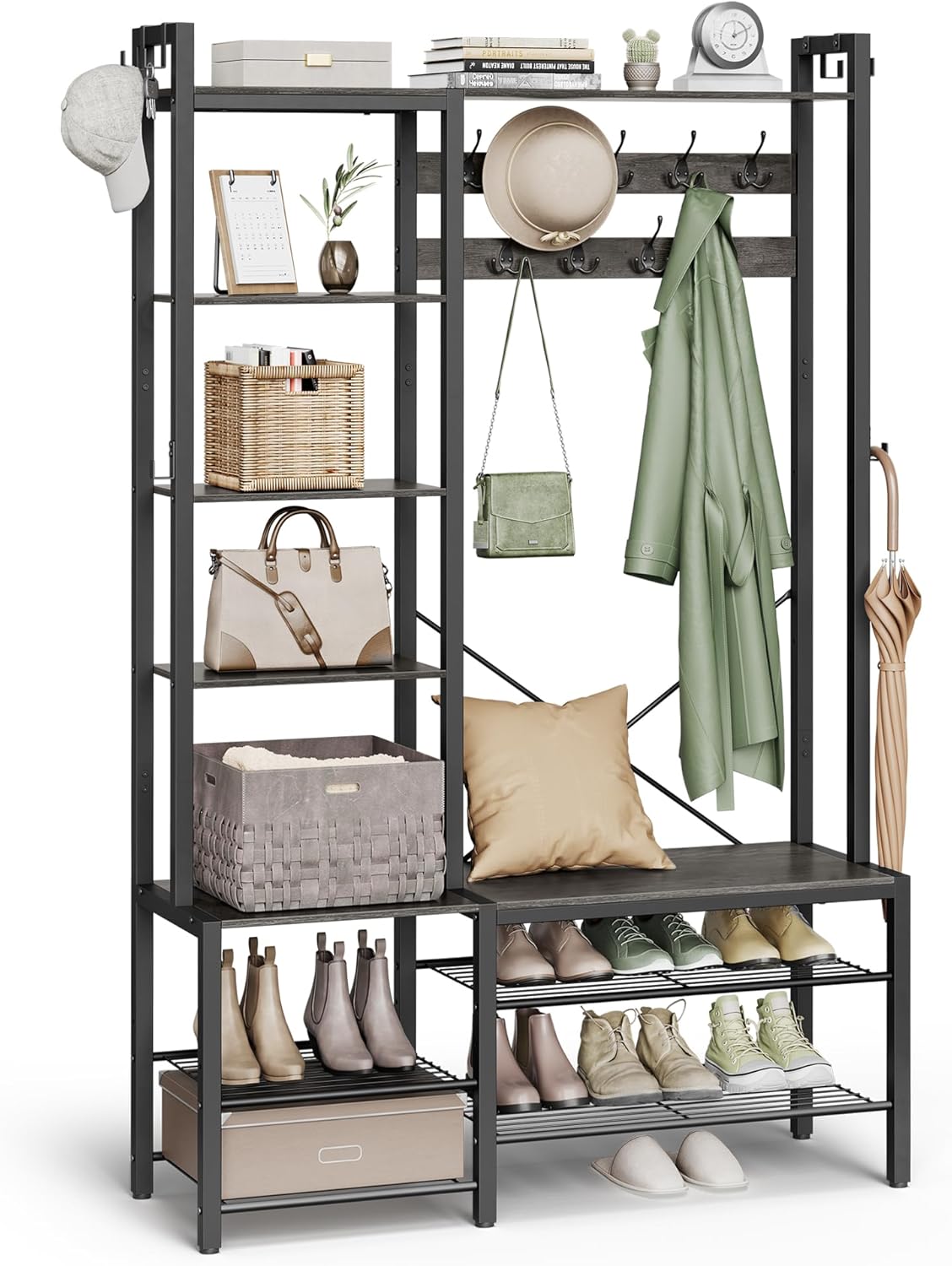 - [4-in-1 Design] This hall tree comes with coat hooks, a bench, a shoe rack, and storage shelves, allowing you to easily organise your clothes, accessories, and essentials in one place!