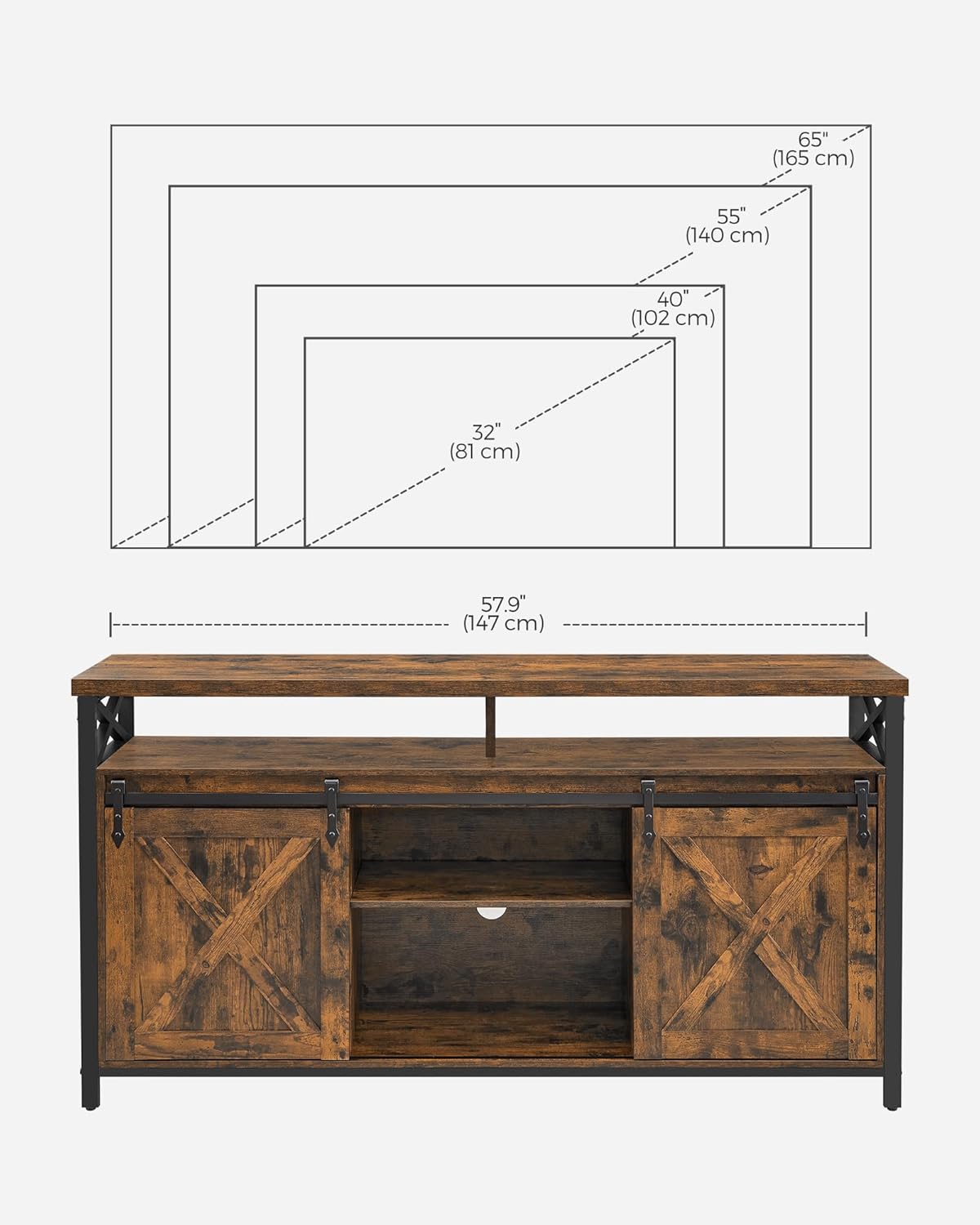 - [Farmhouse Industrial] A pair of sliding barn doors and X-frames for a farmhouse feel, plus a rustic brown tone and steel accent for an industrial vibe—they all combine in this TV unit to make a focal point in your living room