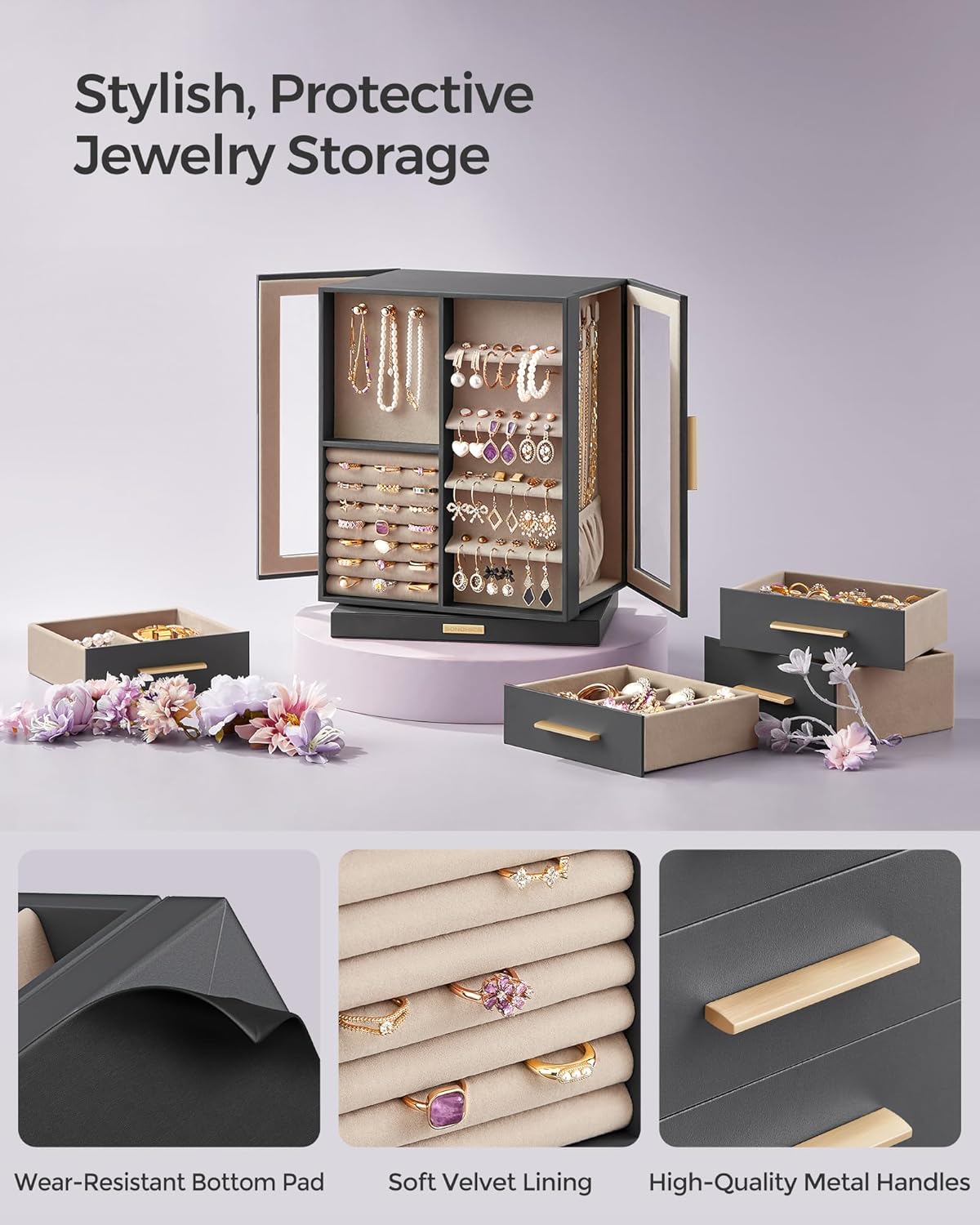 • [Perfect Gift Idea] Present your loved ones with the gift of this exceptional 360° rotating jewelry box on their birthday or anniversary. Or indulge yourself in this exquisite jewelry case because you truly deserve it!