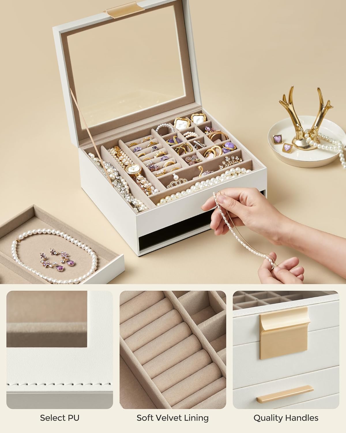 Nordic Hygge Jewelry Box Organizer with Glass Lid, 2-Layer Jewelry Storage, with 1 Drawer, Modern Style