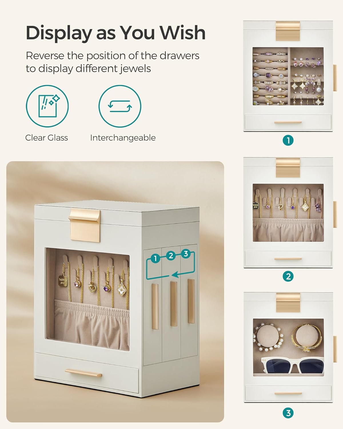 - [Interchangeable Side Drawers] The position of the 3 side drawers can be changed to allow you to have different jewels on display as you wish. And your valuables are kept dust-free behind the clear glass window of this jewelry box!