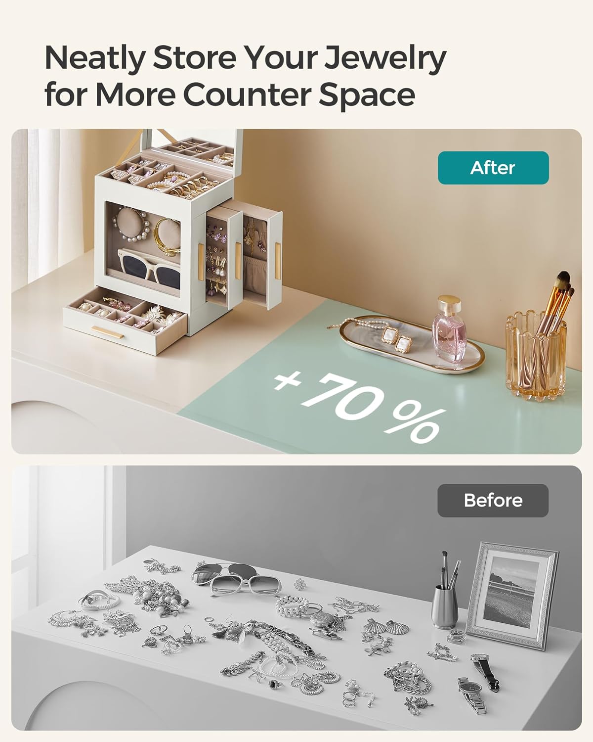 - [Built-In Big Mirror] The big mirror inside this jewelry organizer makes it easy for you to put on your jewelry and check your look when primping yourself up in the morning, saving your precious morning time