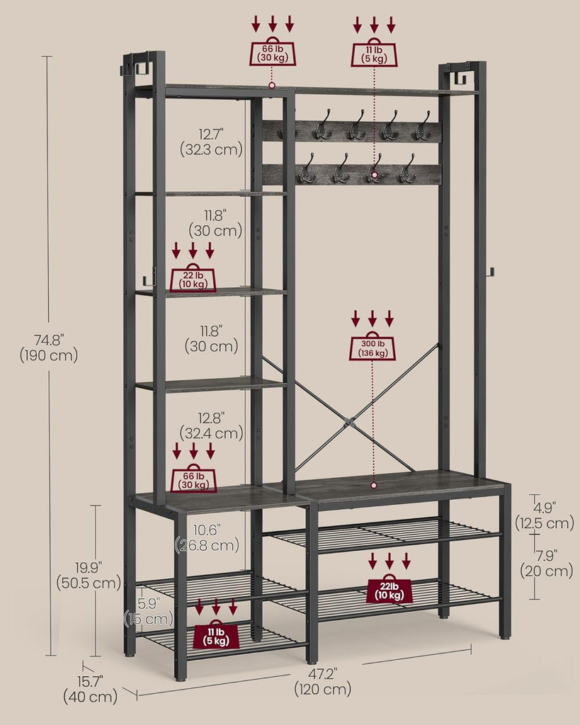 Nordic Hygge Hall Tree with Bench and Shoe Storage – 5 Shelves 9 Coat Hooks in Stone Grey and Ink Black