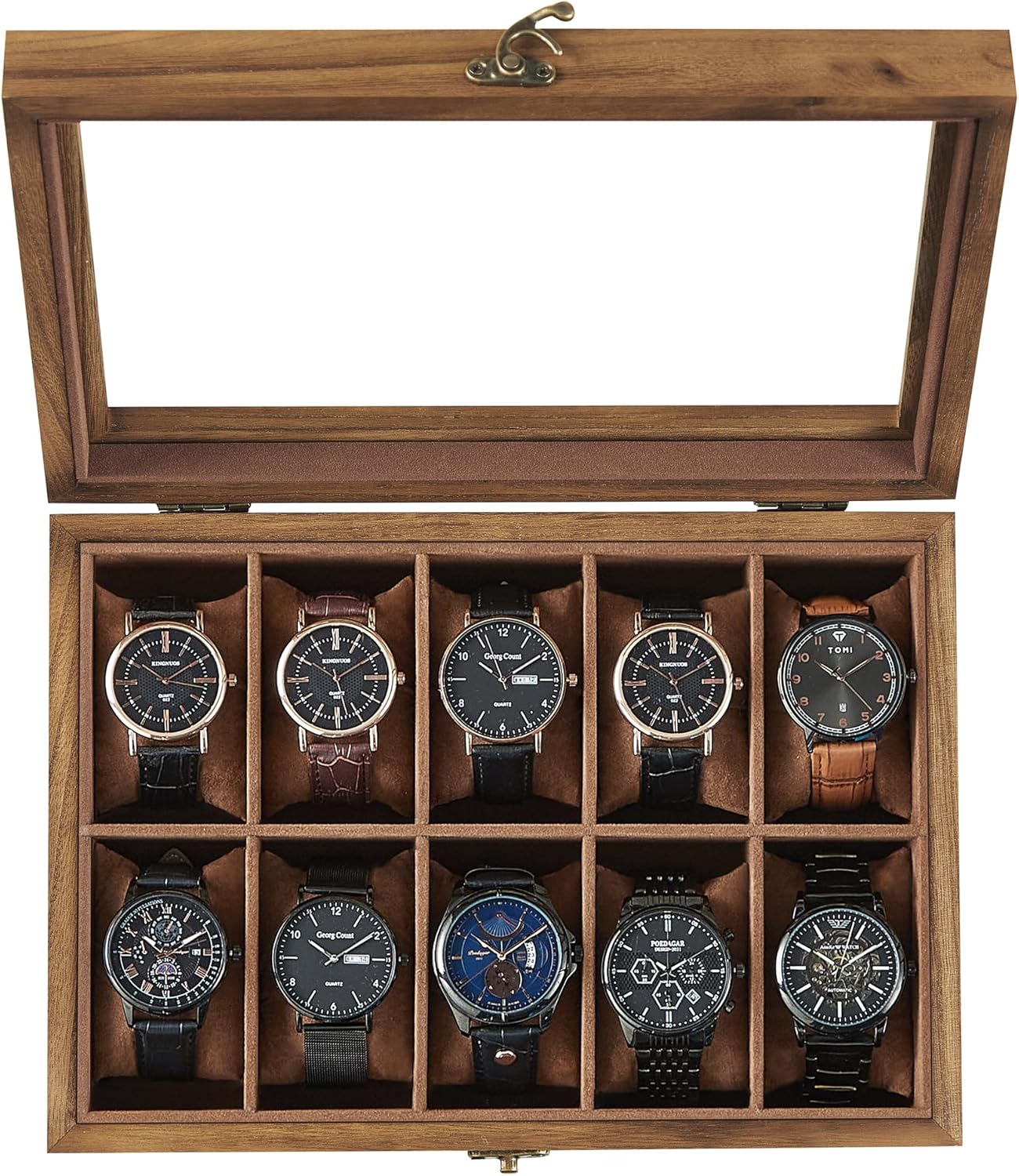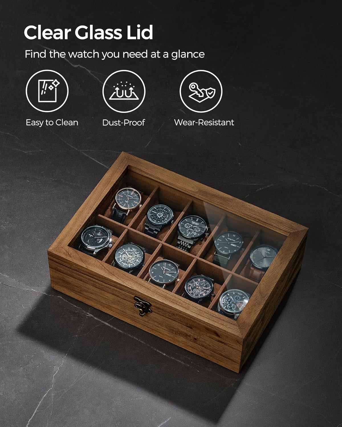 - Large Glass Lid: This watch case comes with a large, clear glass top, so you can show off your watch collection, keep them away from dust, and find your fave instantly to save time on hectic mornings