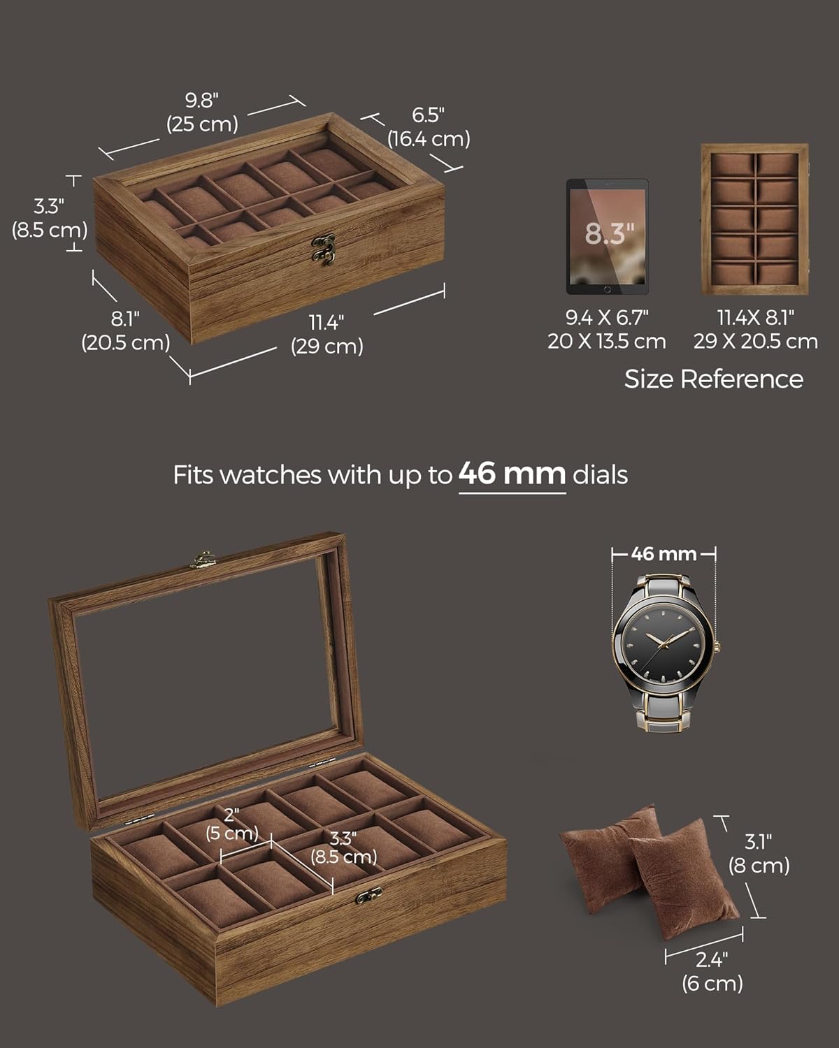 - Stores up to 10 Watches: Boasting 10 slots, this watch case allows you to put your watches with a dial size up to 46 mm all in one convenient spot, so you can easily find the right one without endlessly searching