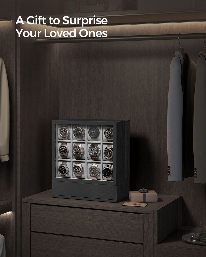 - [Chic, Compact, and Convenient] This watch box measures 5.9 x 11.6 x 12.8 inches and boasts a clear window for displaying up to 12 watches. With its vertical storage design and wood grain surface, this watch box saves tabletop space while adding style