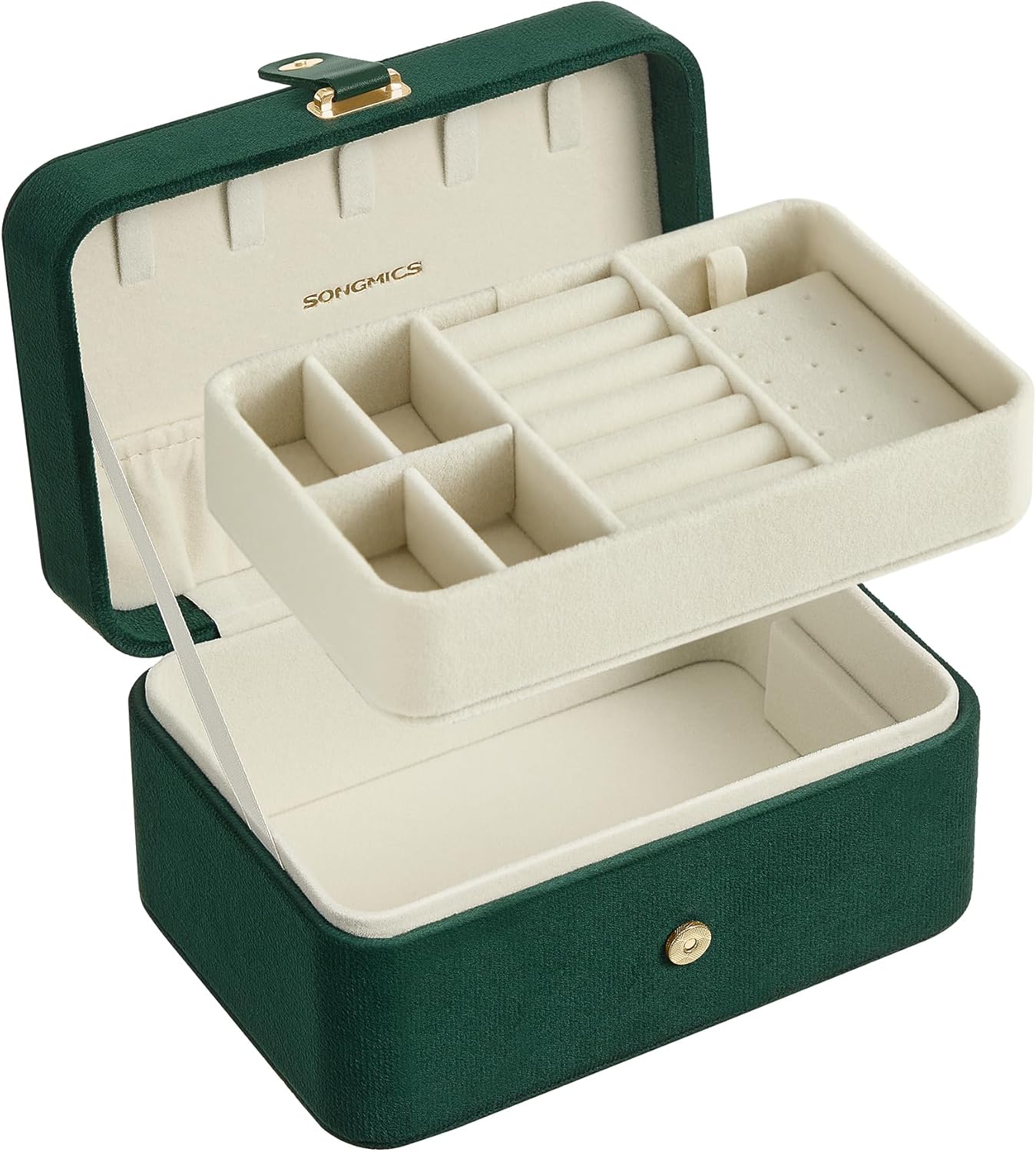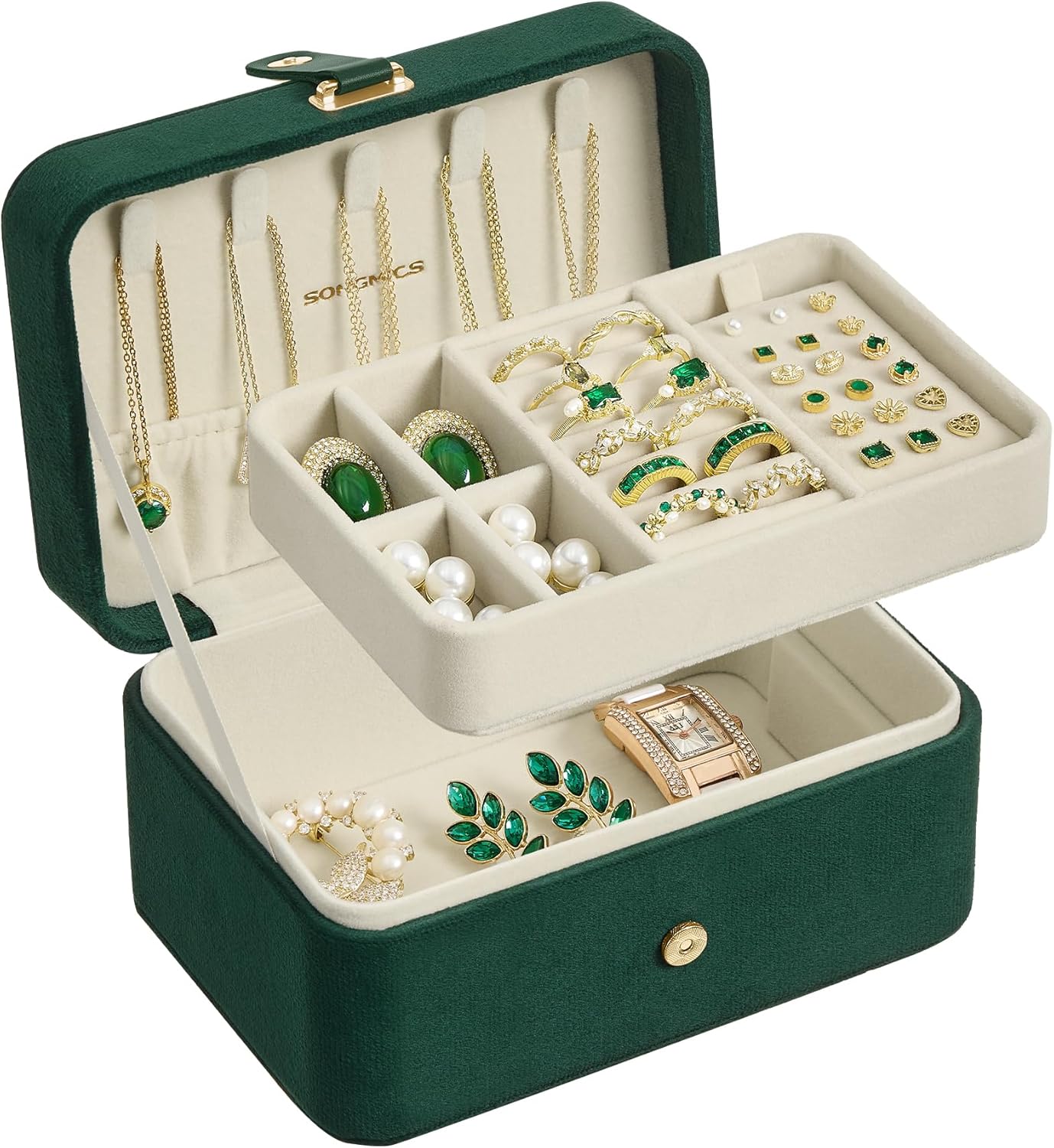 - [Categorized Storage Solution] Featuring a lid with 5 necklace hooks, a removable top jewelry tray for stud earrings and rings, and a bottom compartment for bracelets and larger accessories, this versatile jewelry box meets all your storage needs