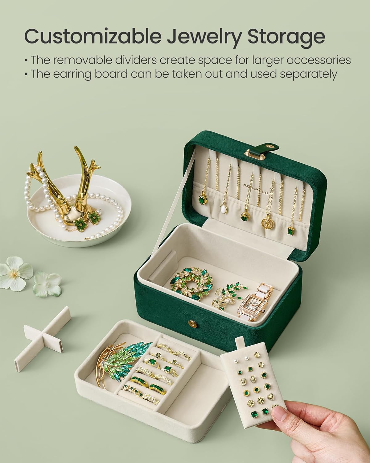 - [Thoughtful Details] This jewelry box boasts removable cross-shaped dividers to accommodate larger jewelry, a detachable earring plate for customizable storage, and a secure magnetic button for reliable closure