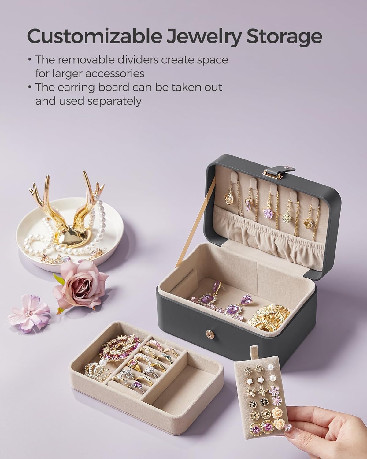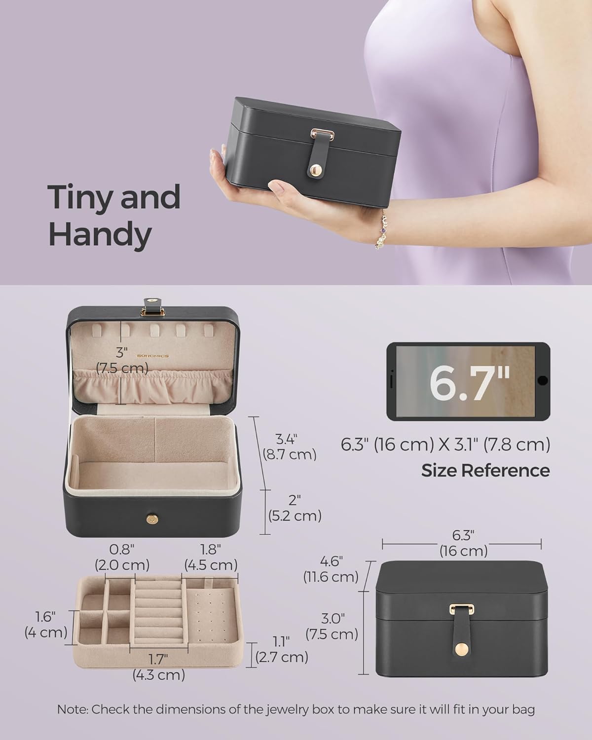 - [Perfect Gift] With its chic design and clever functionality, this compact yet spacious jewelry box makes an ideal gift for yourself or your travel-savvy friends. It's a stylish and practical way to carry your favorite jewelry while on the go