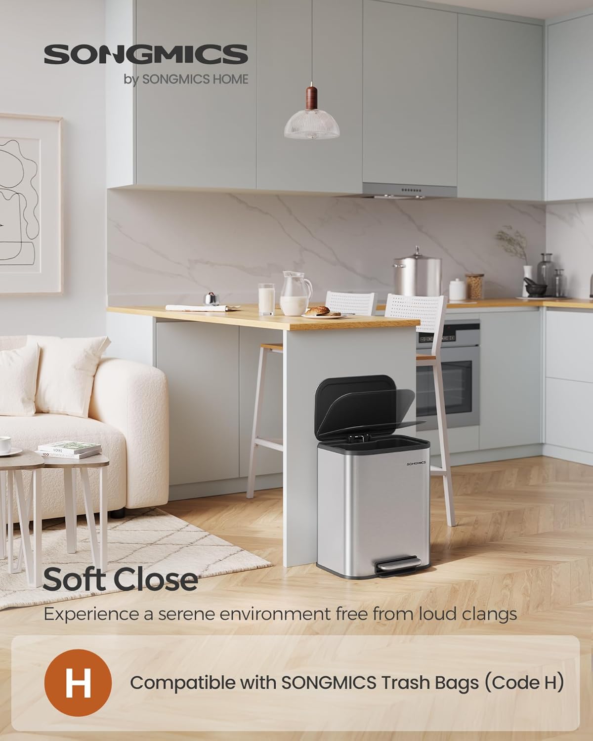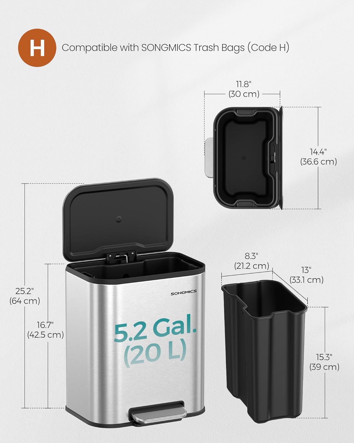- [Compact and Chic] This 5.2-gallon trash can, with its compact design, is perfect for small spaces and ideal for one or two people. Its modern, minimalist design easily blends in with a variety of home decor styles
