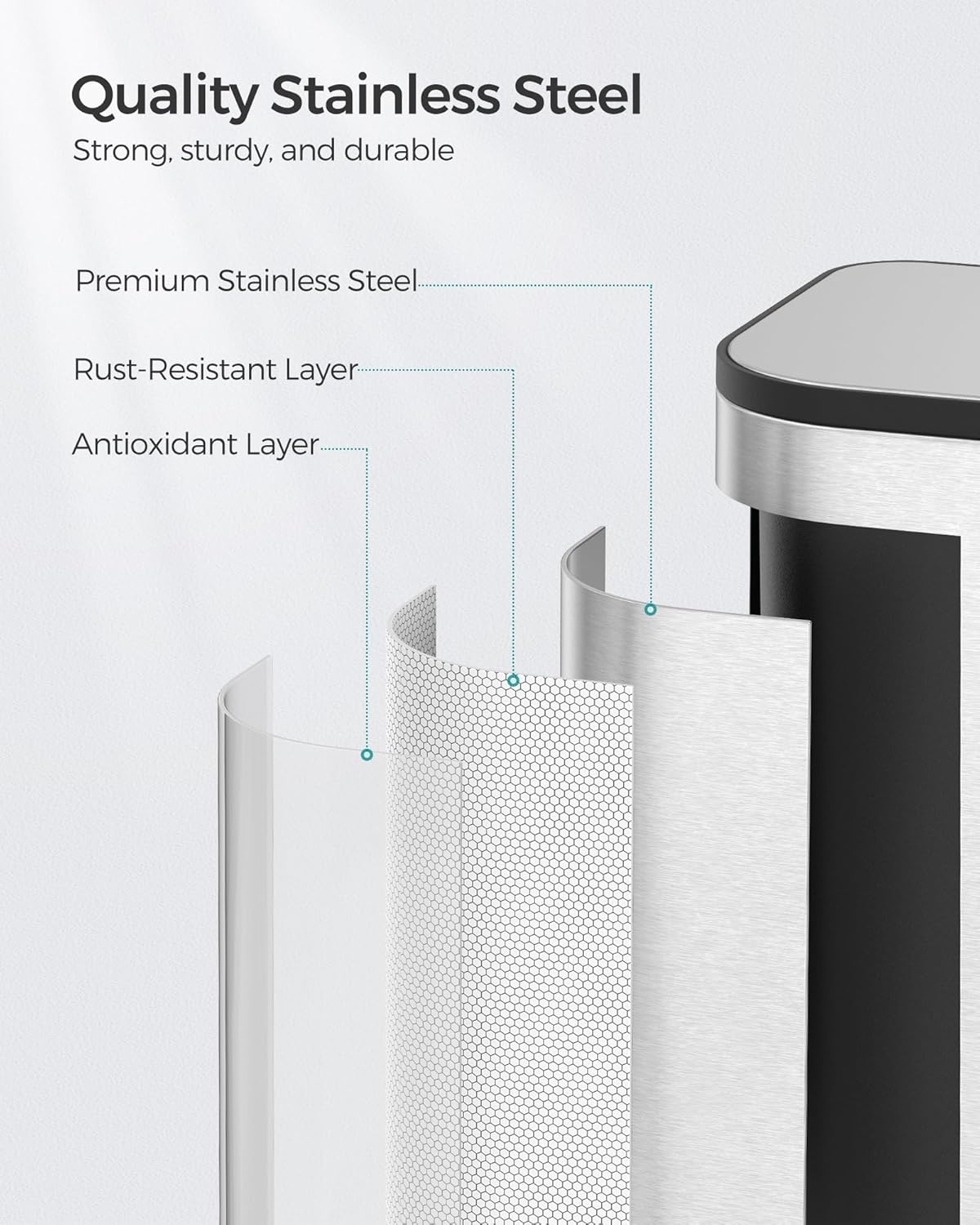 - [Durable and Stable] Made from robust stainless steel, this trash bin is resistant to rust, dirt, and is easy to clean. The base is equipped with non-slip pads to enhance stability, making it difficult for pets to tip it over