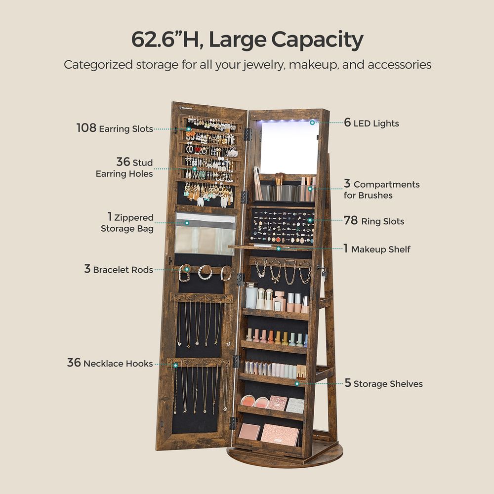 - [Full-Length Mirror with Adjustable LED Lights] This jewelry cabinet boasts a full-length mirror with dimmable LED lights that have 3 shades of light and a smart memory function—you can use the touch button to find the perfect lighting to check your look