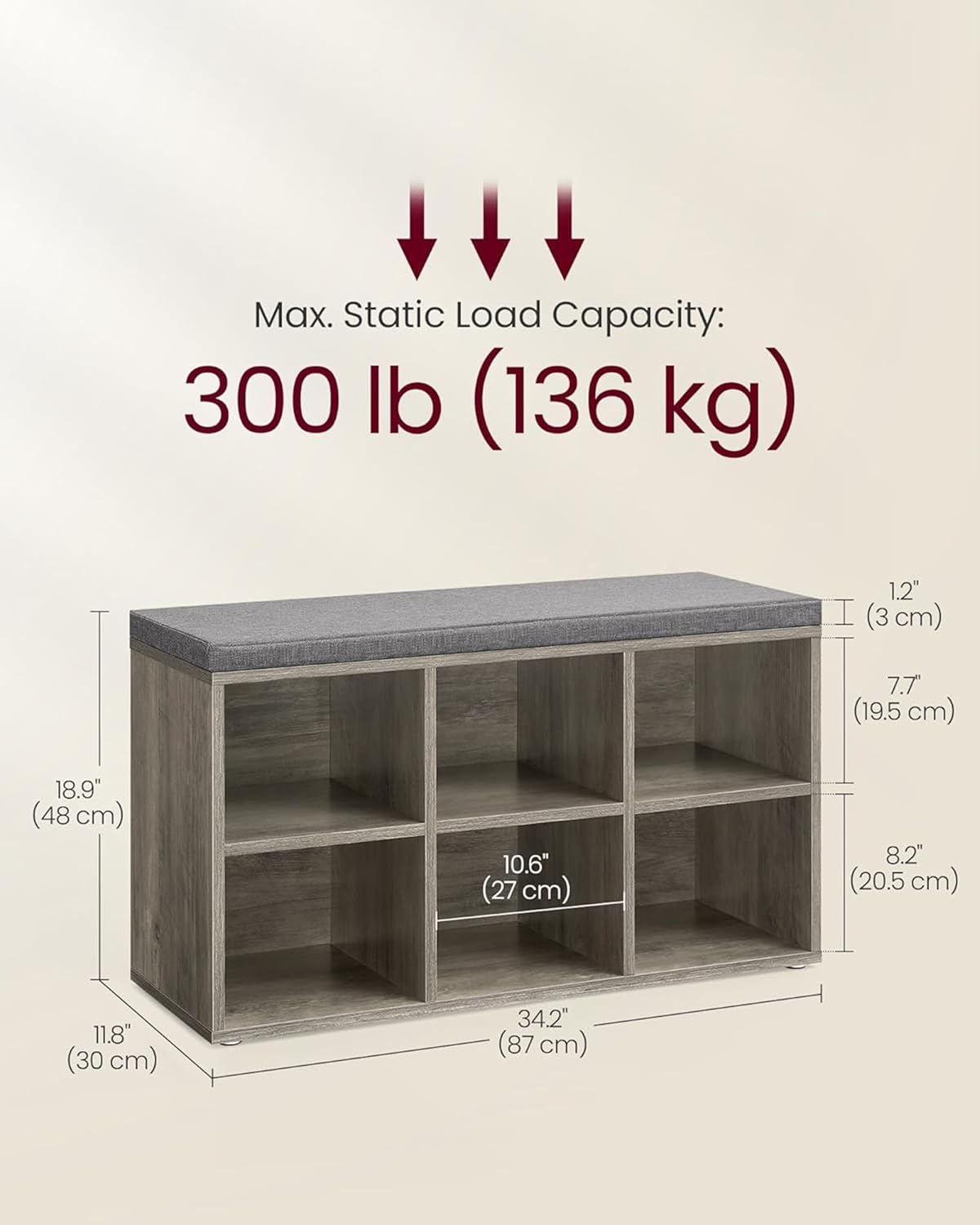 - 【FOR SMALL SPACES】If floor space is limited and a mess-free entryway is a priority, this shoe bench is the solution to your needs; at 11.8"D x 34.3"W x 18.9"H, it's ideal for tight spaces in the entryway, bedroom, or living room