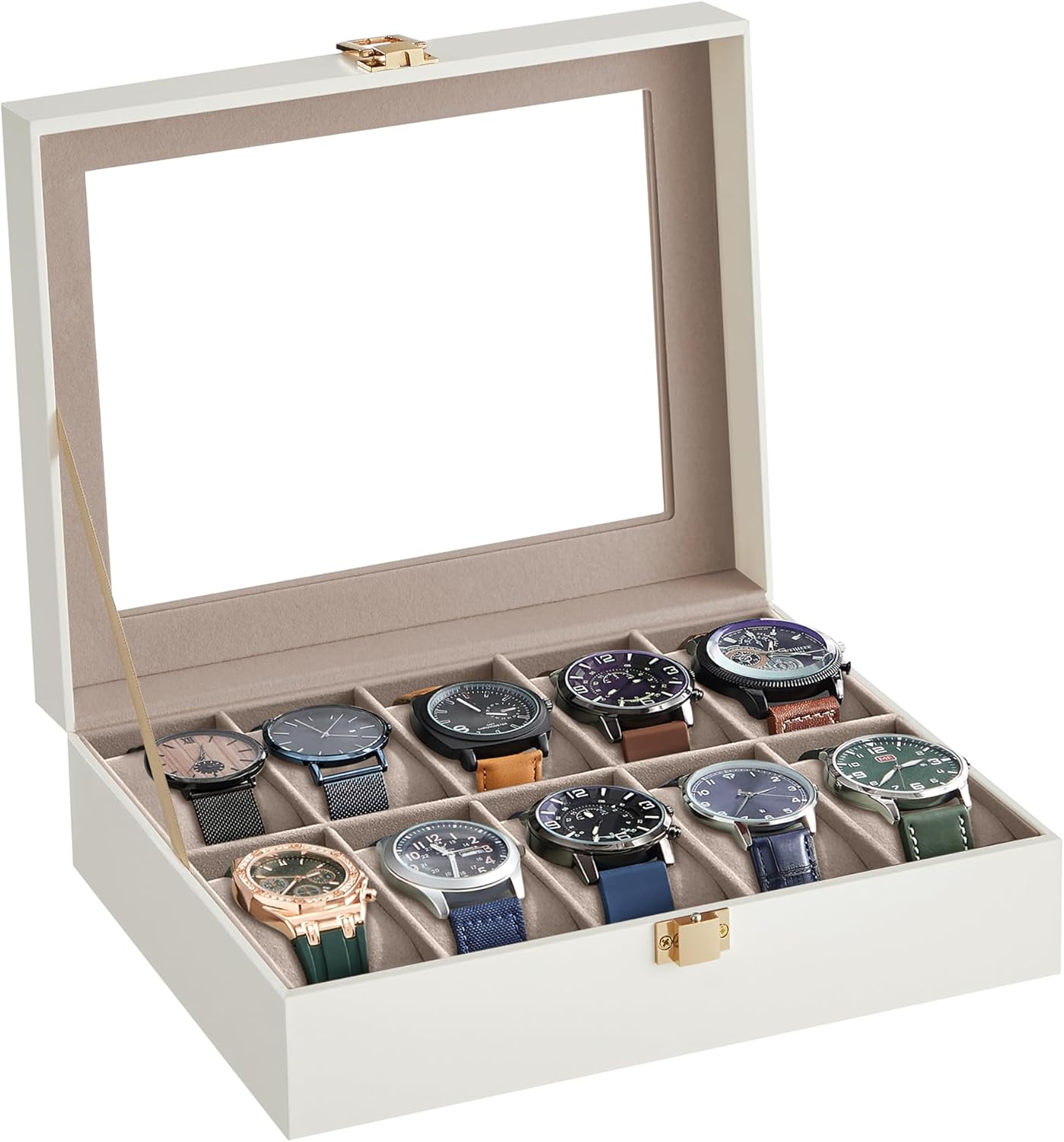 Nordic Hygge Watch Box with 10 Slots, Watch Case with Glass Lid, Watch Display Box with Removable Watch Pillows