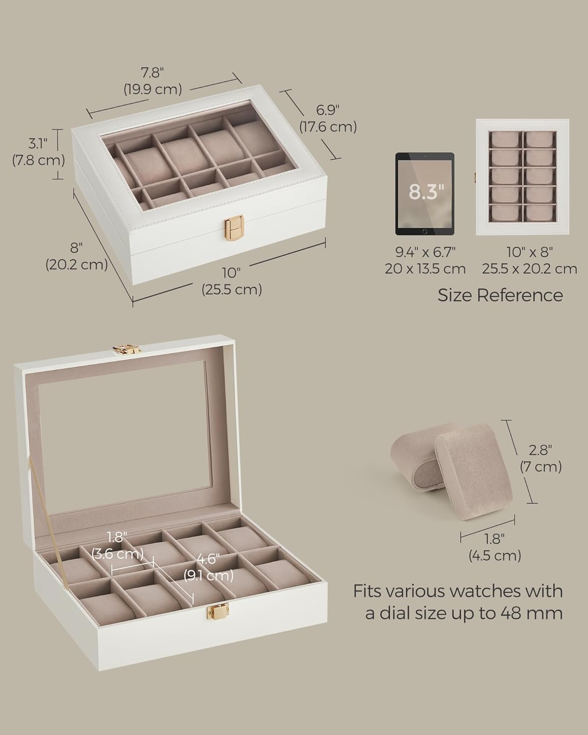 • [10 Spacious Watch Slots] This 10-slot watch display case offers enough space for your growing watch collection. Each slot is spacious and can fit different types of watches with a dial size up to 48 mm